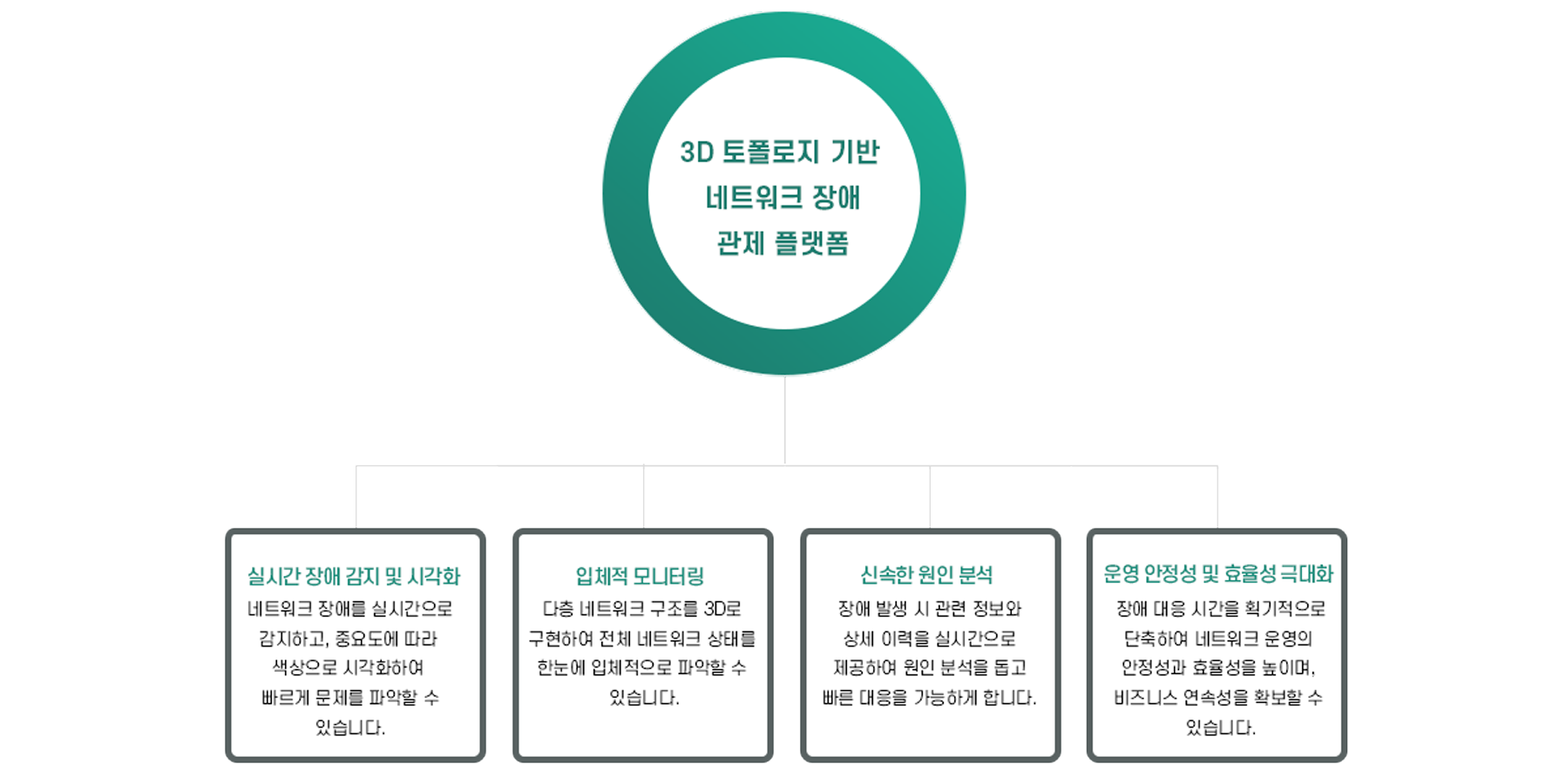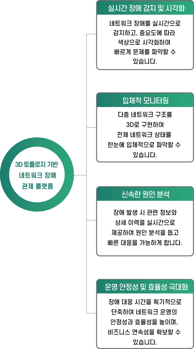 첨단 3D 토폴로지를 활용하여 복잡한 네트워크 환경에서도 시각적이고 직관적인 장애 분석을 제공합니다.