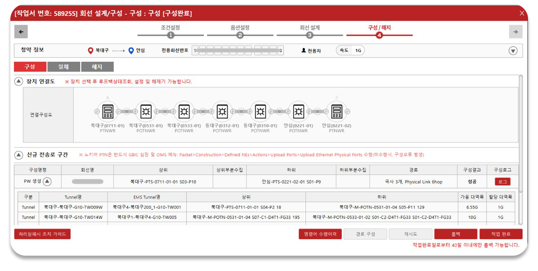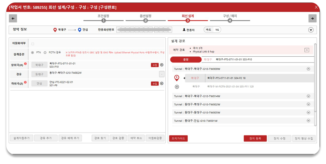 One-Click 으로 제약 조건 및 최단경로(Dijkstra) 알고리즘을 적용한 회선 경로를 자동 산출하며,