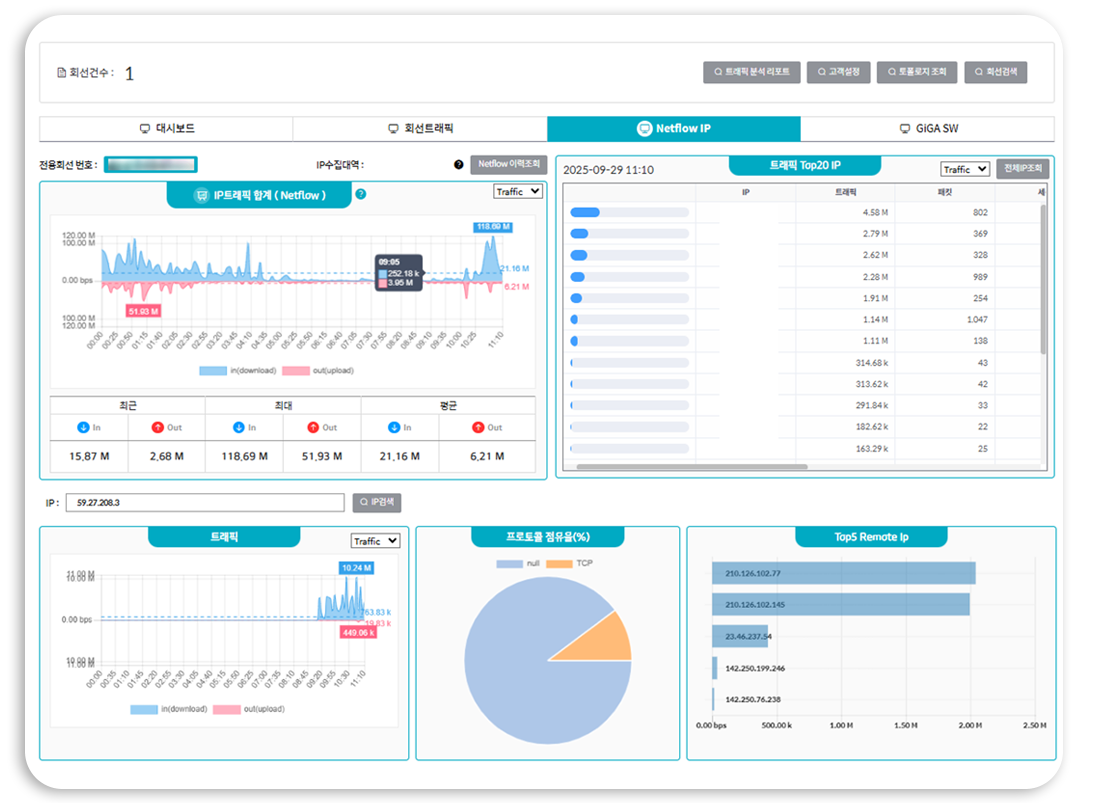 코넷 회선의 트래픽 현황과 Netflow 데이터를 실시간으로 제공하여, 네트워크 흐름을 면밀히 분석할 수 있습니다. 또한, 코넷회선 관련 장비에 대한 관제 기능을 지원하여, 장비 상태를 체계적으로
